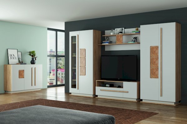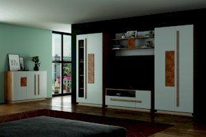 Шкаф с комбинированными распашными фасадами на петлях без доводчиков. Слева-фасад со стеклянной вставкой, справа-глухой фасад с декоративными элементами прямоугольной формы, имитирующими спил дерева. Эффект древесного рисунка достигается благодаря техники УФ-печати.