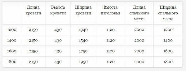 Кровать доступна в 4-х размерах:  1200, 1400, 1600 и 1800 мм.